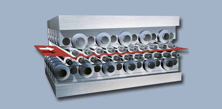 Beim Walzenrichten durchläuft ein Blech mehrere aufeinanderfolgende Wechselbiegungen. Vom Einlauf bis zum Auslauf der Walzenrichtmaschine sind die Richtwalzen versetzt angeordnet.